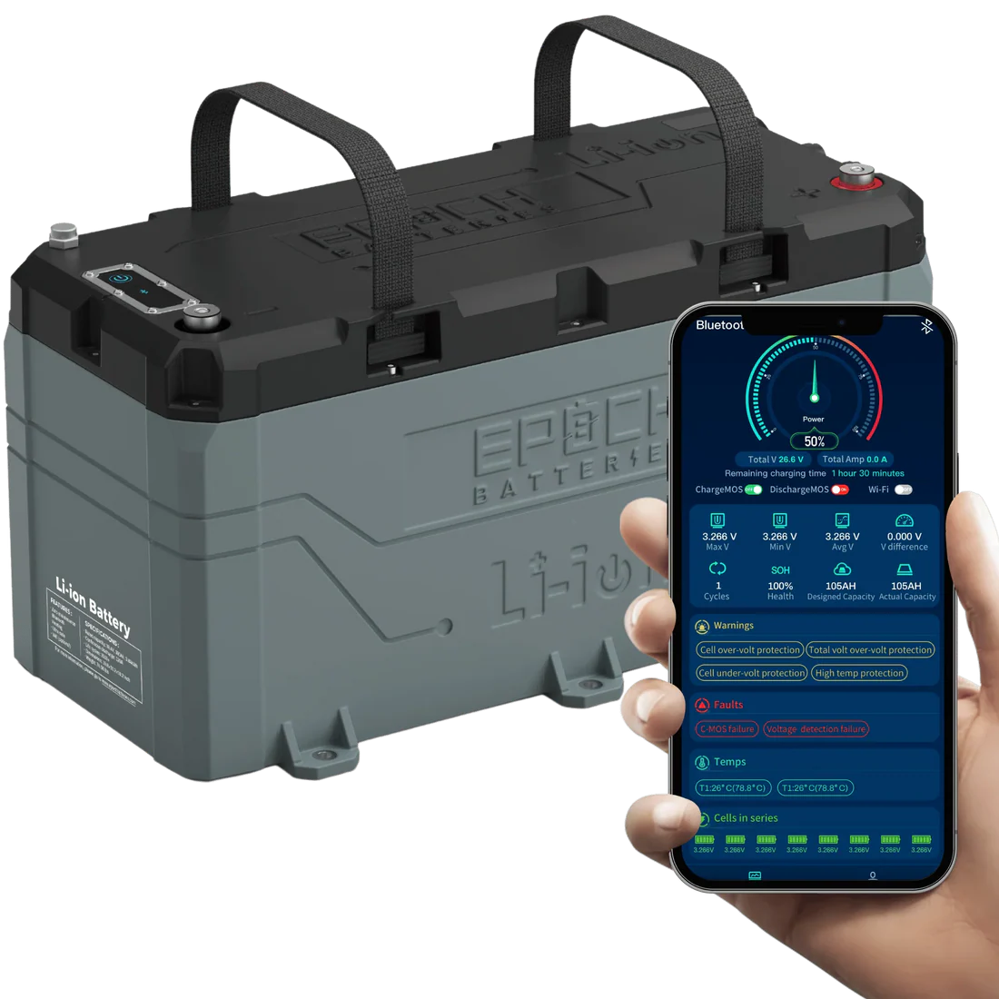 Experience advanced power management with the Epoch 36V 100Ah LiFePO4 Battery featuring heated technology and Bluetooth connectivity. Designed for golf carts and electric vehicles, this battery offers efficient energy delivery, extended runtime, and intelligent monitoring via Bluetooth for real-time battery status.